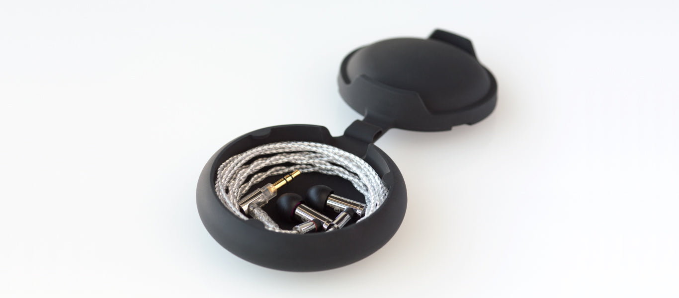 With this silicon carry case, the cables can be rolled up and stored easily. The earphones themselves are gently secured using thin dome-shaped silicon covers.